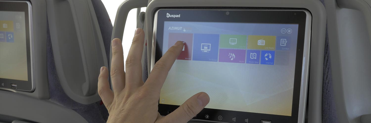 Nuestras pantallas multimedia individuales con puerto USB y con TV a la carta para disfrutar de sus series o películas favoritas o ver los programas en directo.